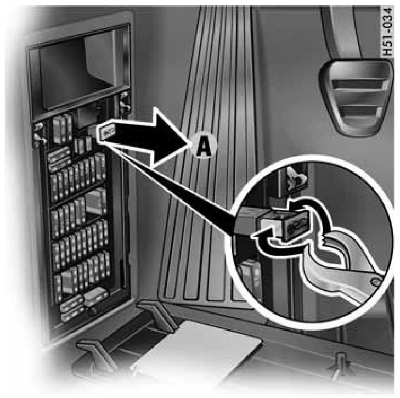 2. Remove lid on fuse box, use plastic fuse gripper and pull emergency power contact (A) out of the fuse box.