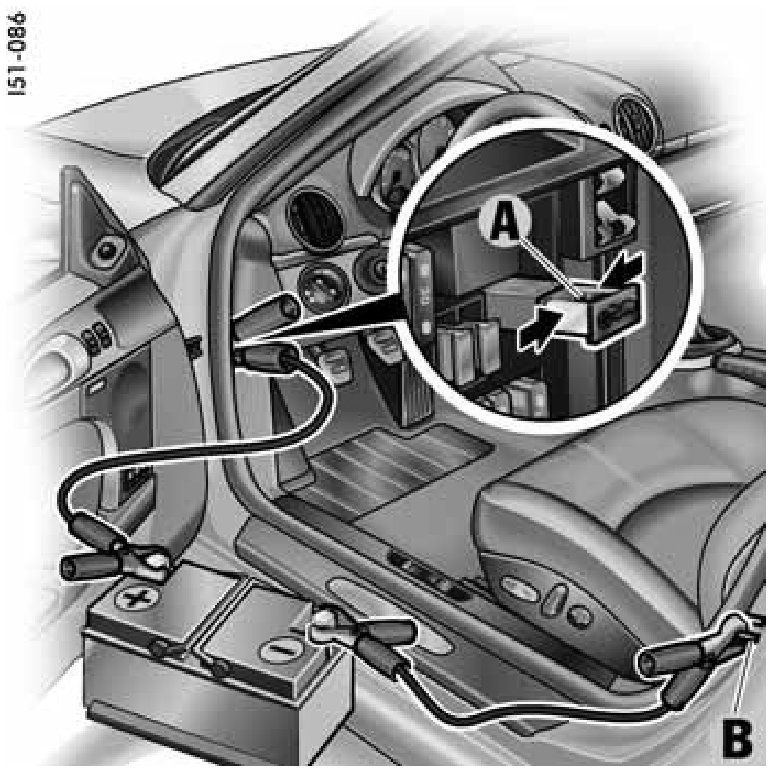 - In the event of a flat battery, the release motors of both lids can be supplied with power through the power feed via a battery jump lead.