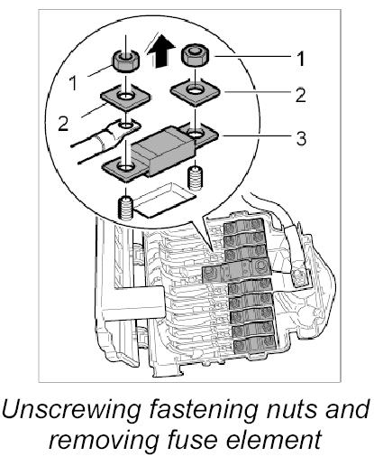 2. Unscrew the fastening nuts on the faulty fuse element -1-, remove the washer -2- and take out the fuse element -3-.