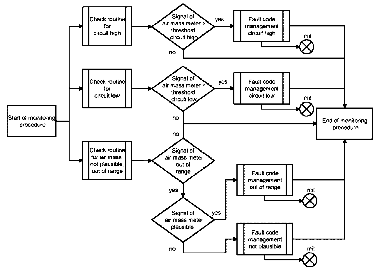 The output voltage of the air mass meter is a measure of air mass. The diagnostic routine compares the mass flow measured by the air mass meter with a calculated mass flow, derived from engine speed an throttle position.