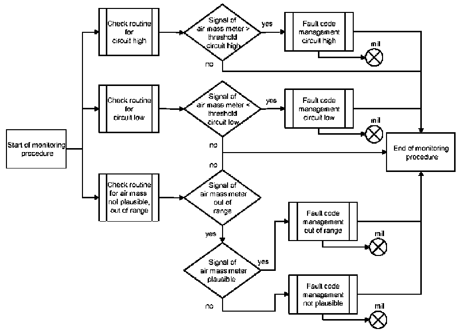 If the output voltage of the air mass meter is above a threshold value, a fault is detected.If the output voltage of the air mass meter is lower than a threshold value, a fault is detected.