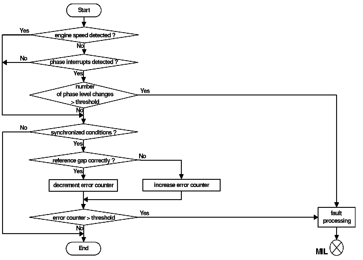 Under normal operating conditions, the flywheel position reference gap is monitored. At a loss of synchronization (more than one tooth difference between expected and observed gap position), the error counter is increased. If the gap is determined correctly the error counter is decreased. As soon as the error counter reaches a certain threshold an engine speed sensor malfunction is detected.
