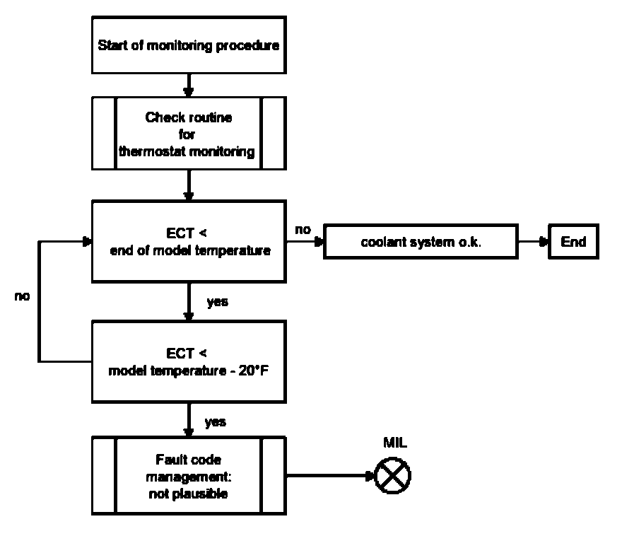 If the engine coolant temperature does not reach a certain value under normal driving conditions, the coolant system is defective (see graph).