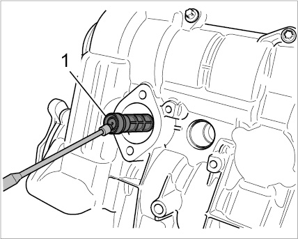 6. Pull the oil strainer -1- out of the cylinder head bore using a bar magnet. Clean using solvent naphtha, check for damage and soiling, and replace if necessary. Pay attention to the installation position.