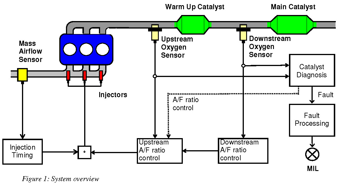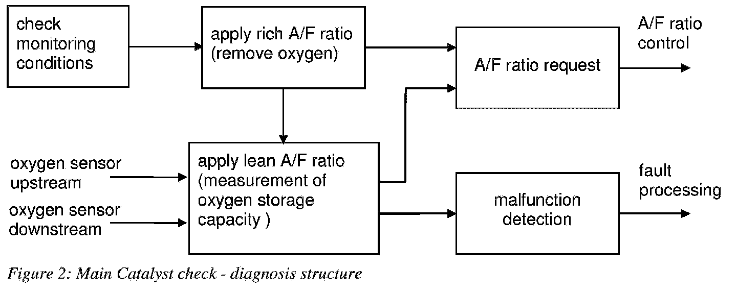 The main catalyst check is based on the direct measurement of the catalyst's OSC during the transition from a rich to a lean air-fuel mixture. The required set up is depicted in figure 1. The air-fuel ratio can be precisely determined with the upstream wide band oxygen sensor. The downstream oxygen sensor delivers information about the OSC of the catalyst.