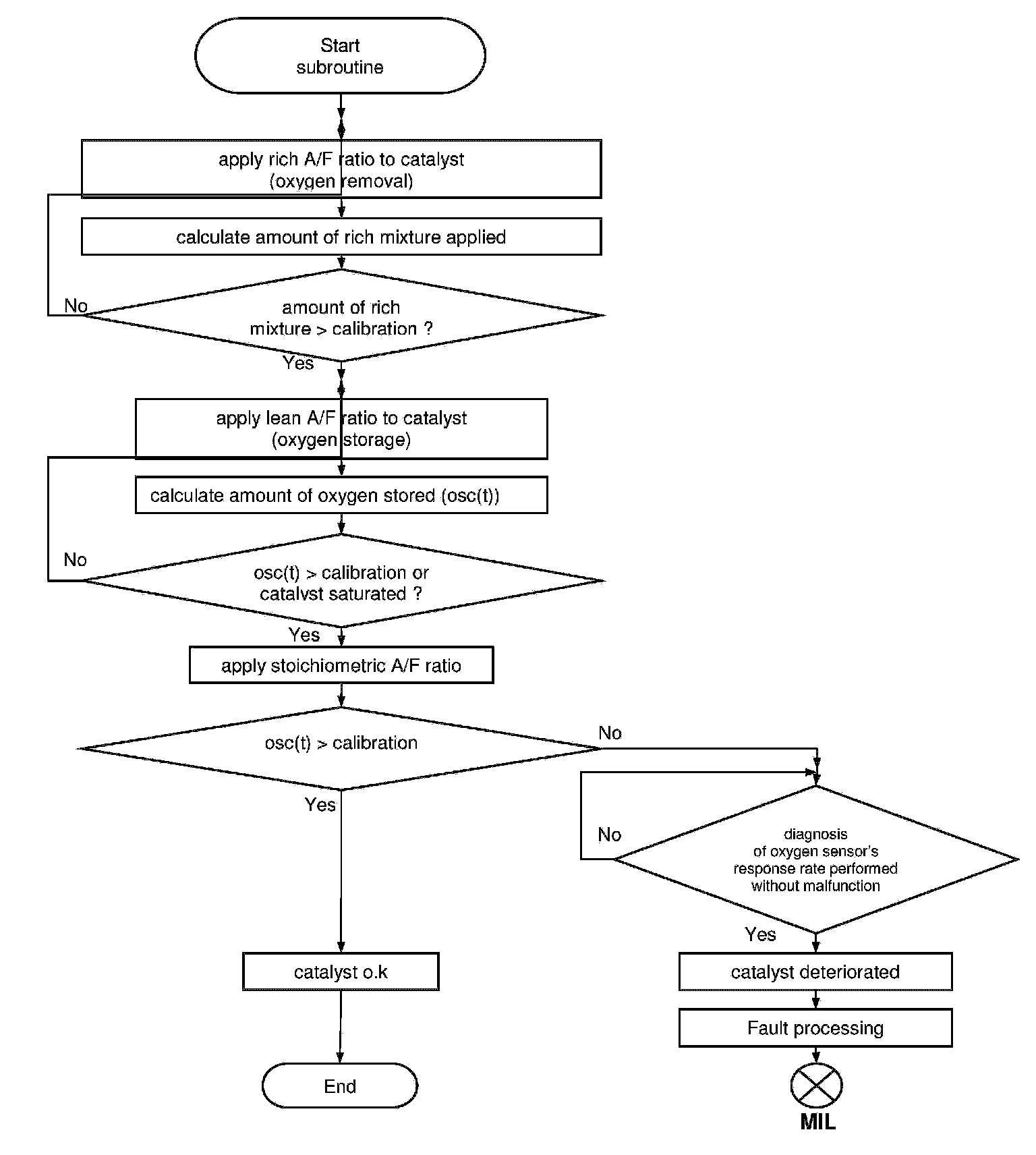 In a two step process oxygen is first completely flushed out of the catalyst with a rich air-fuel mixture. The downstream oxygen sensor indicates this with a voltage signal that is greater than a calibrated value. In the second step a lean air-fuel mixture is flushed into the catalyst and the amount of oxygen stored is calculated1 right up to the oxygen overflow point.