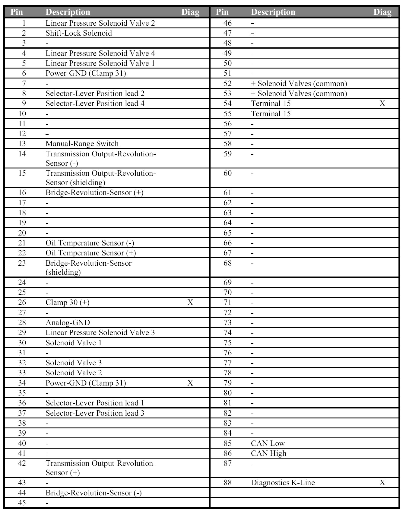 Note: Column "Diag" shows the pins which are necessary for diagnostic operation.