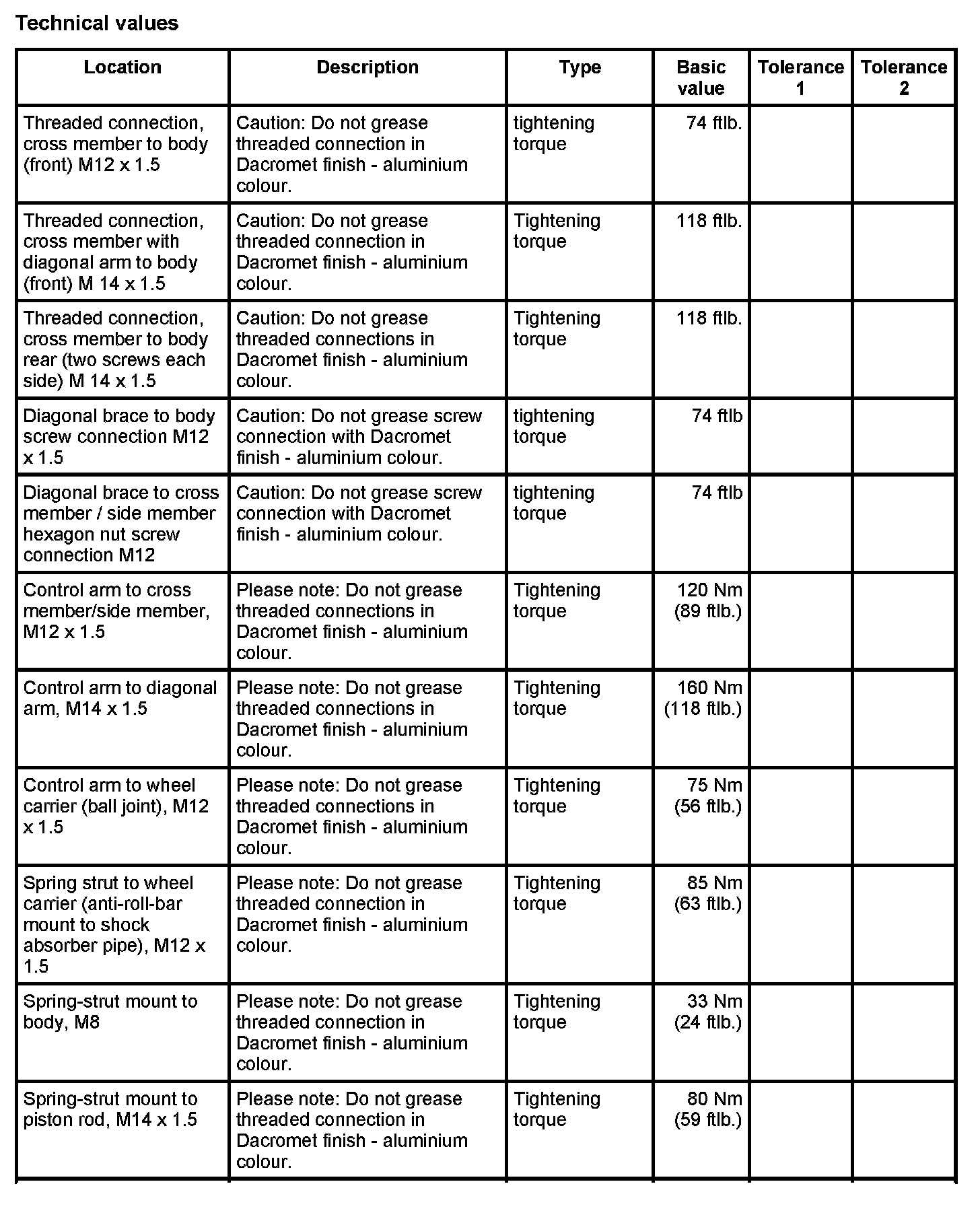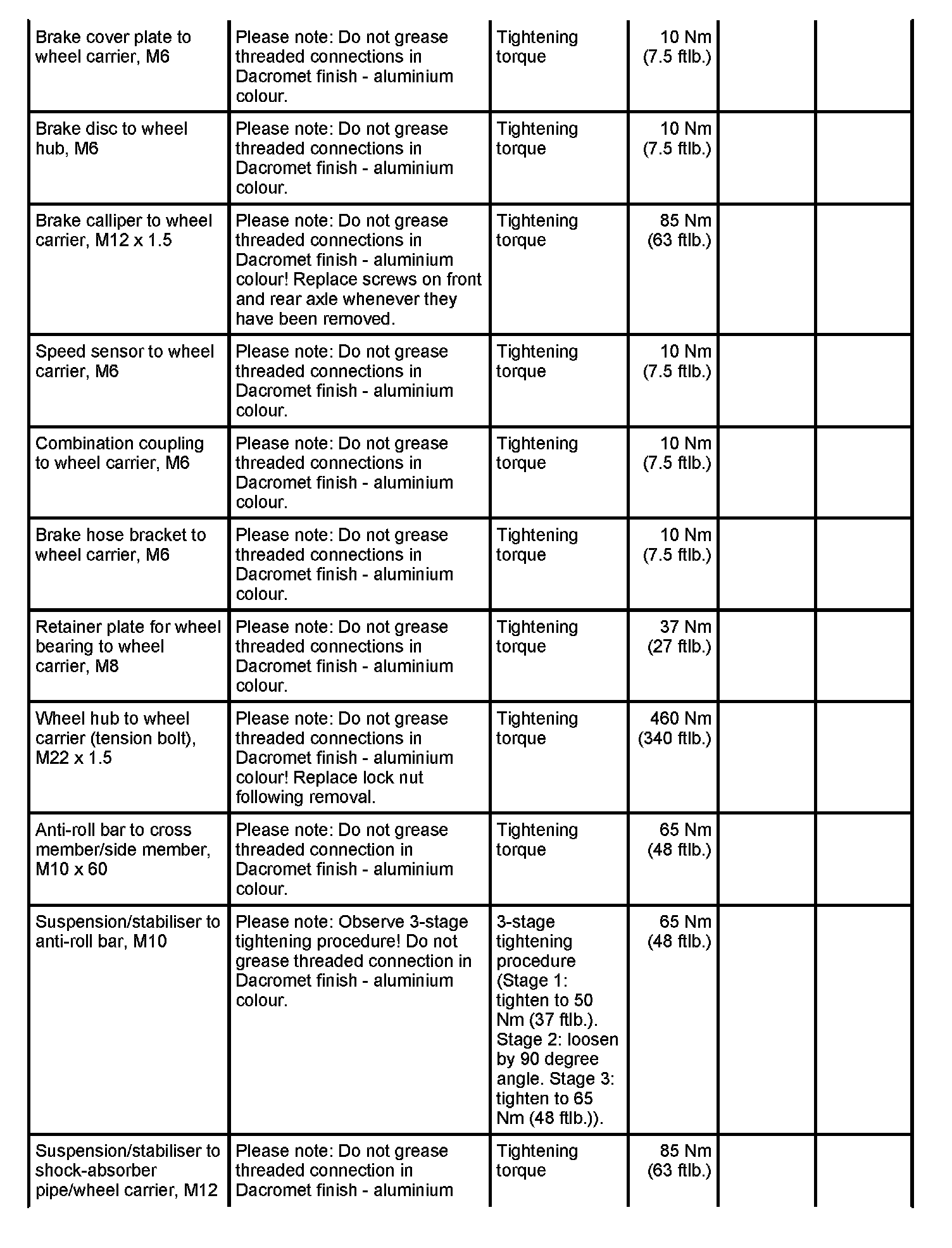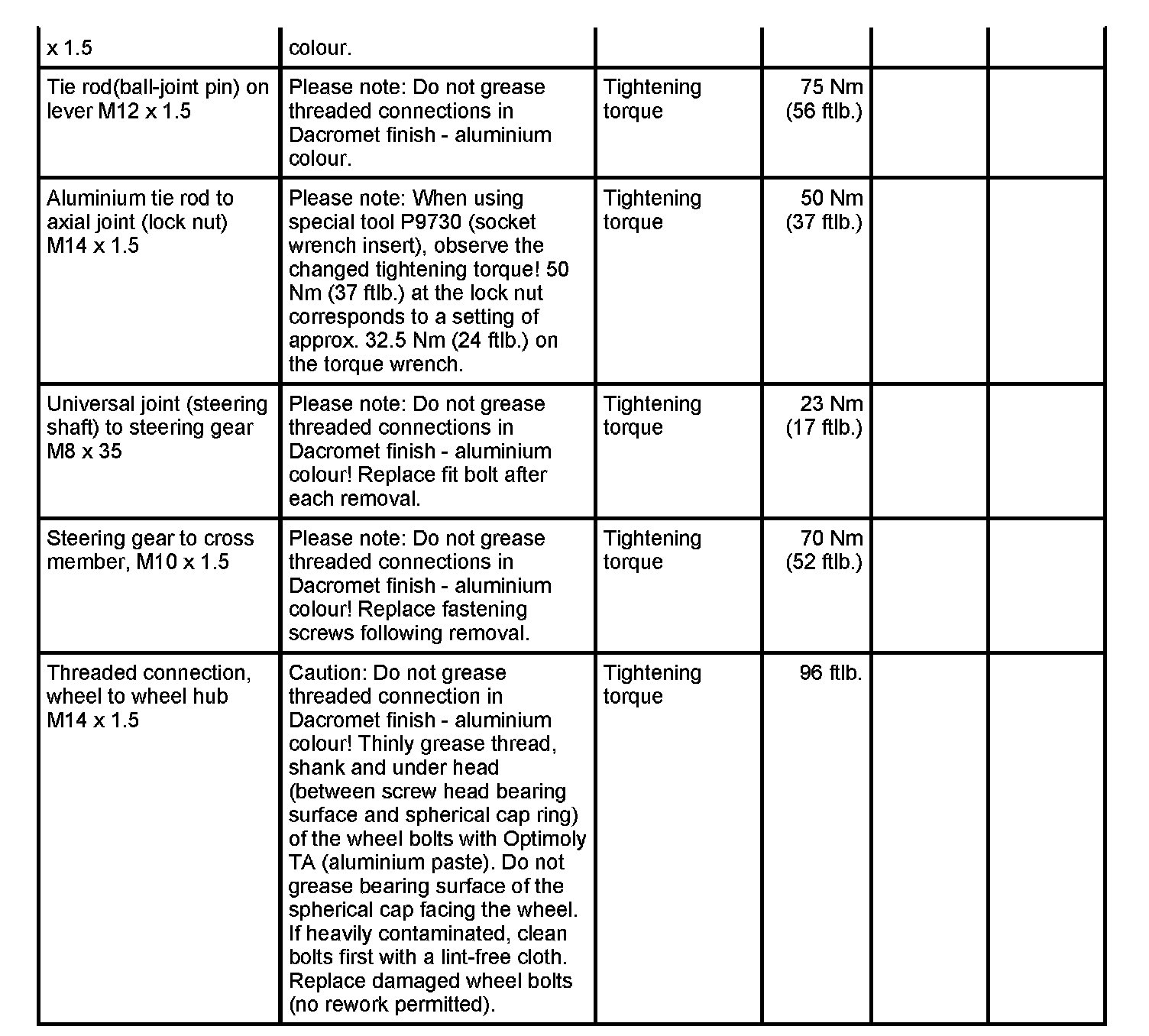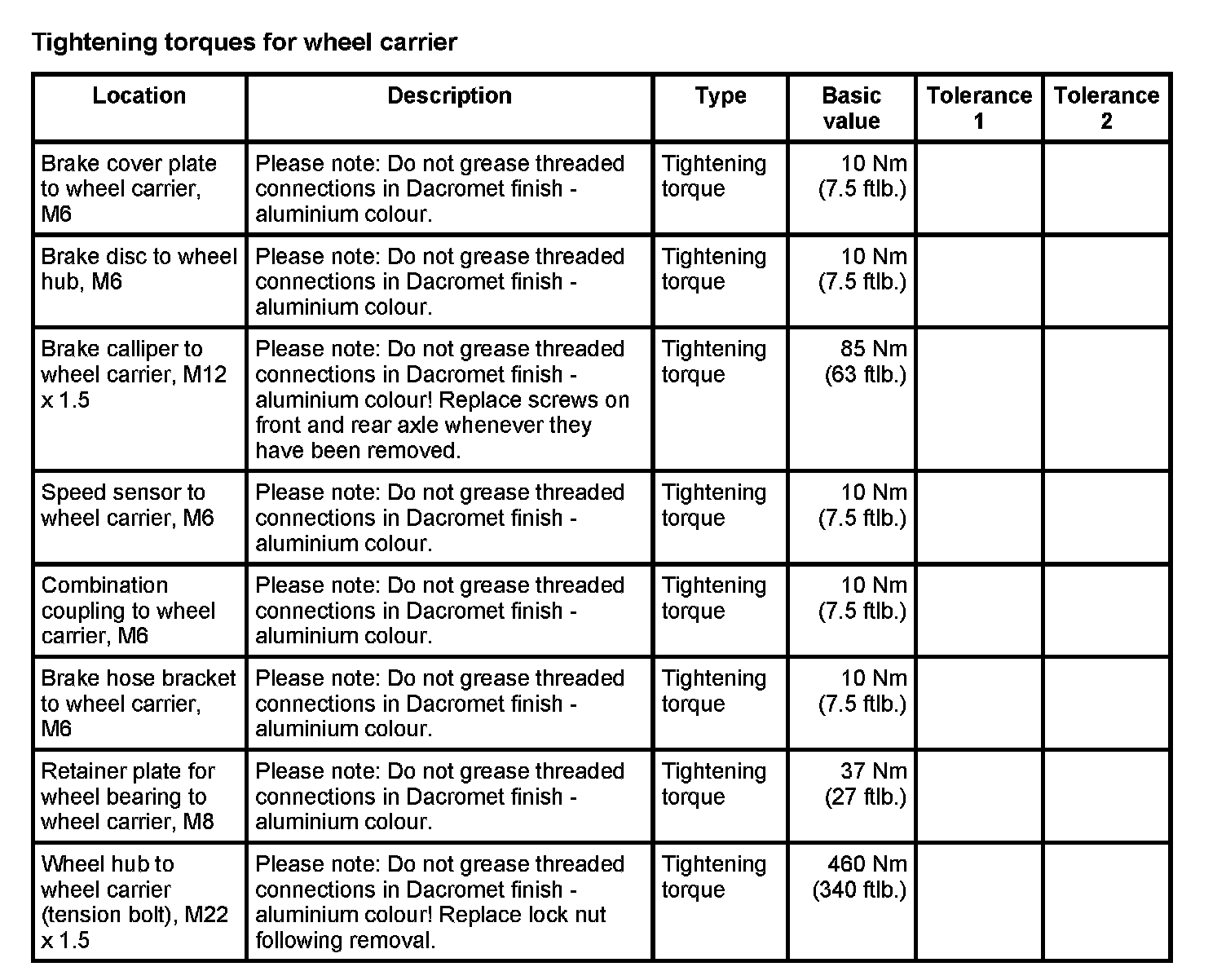WM 400000 Tightening torques for front axle