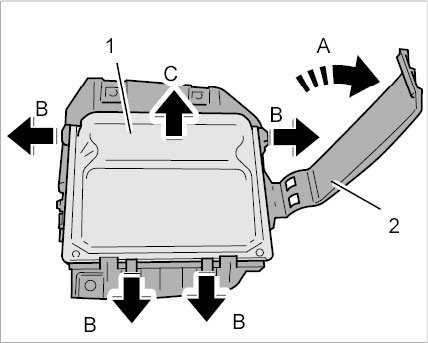 3.2. Release the holder at the four clips -arrows B- and remove transmission control unit (PDK) -1- from the holder -arrow C-.