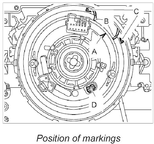 INFORMATION: Ensure that the arrow -A- of the rotor is positioned between the markings -B- of the arrows -C- of the airbag contact unit and that the latch -D- is engaged.