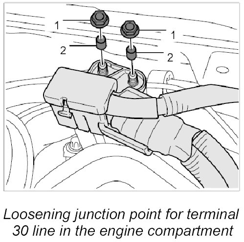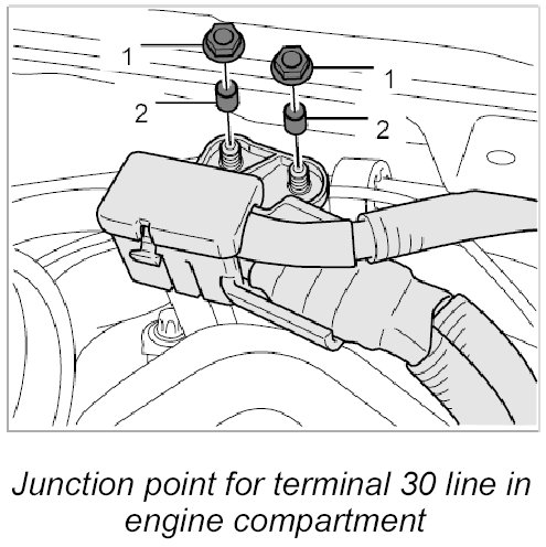 1. Loosen junction point for terminal 30 line in the engine compartment.