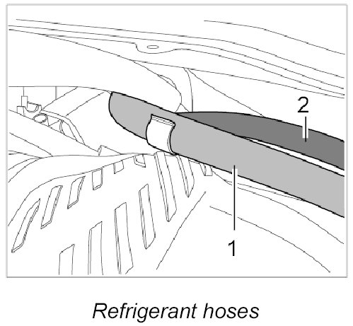 6. Unclip refrigerant hoses -1- and -2- between body and intake-air distributor.