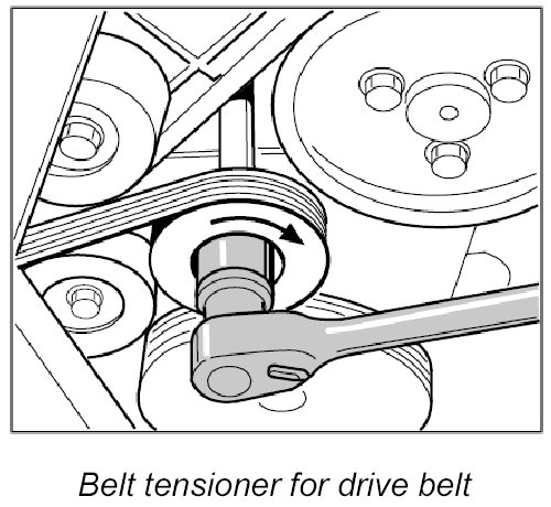 12. Turn the tensioning roller clockwise using a ring wrench (a/f 24), position the drive belt and then tension it.