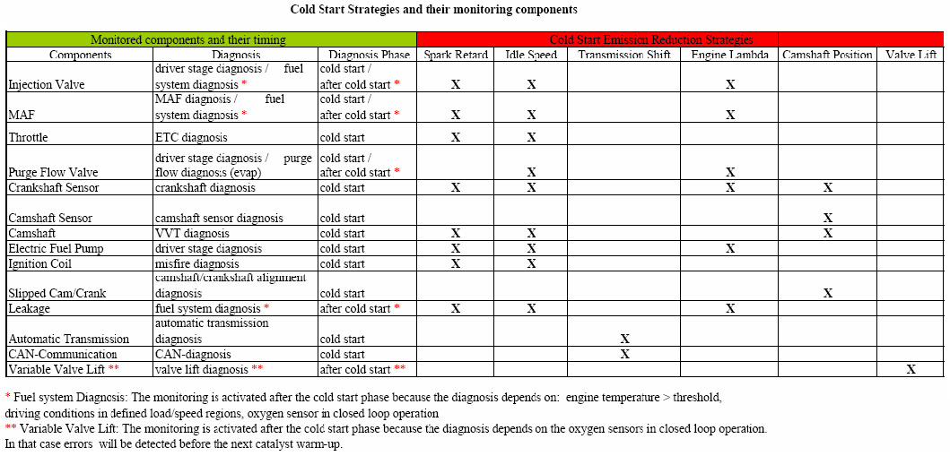 According to (e)(11.2.1), the individual component related to the above strategies has to be monitored. The table below demonstrates that all catalyst heating measures are covered by components which are monitored individually. The long term fuel system and the valve lift diagnosis, which need a lambda signal for monitoring, are finished after the catalyst warm-up phase. Errors will be detected before the next catalyst warm-up.