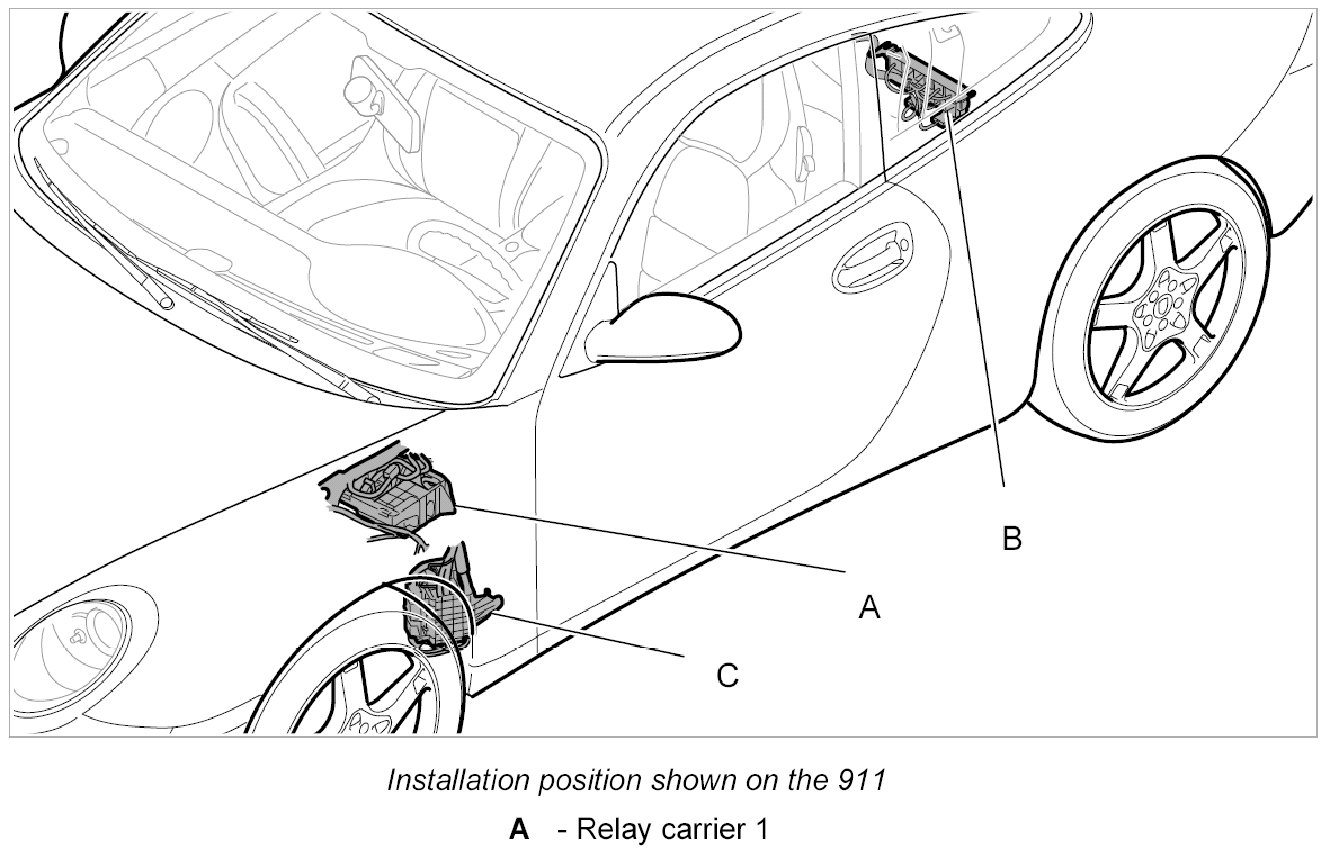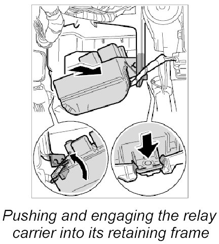 1. -A- Pull apart both retaining lugs on relay carrier support and press the relay carrier upward.