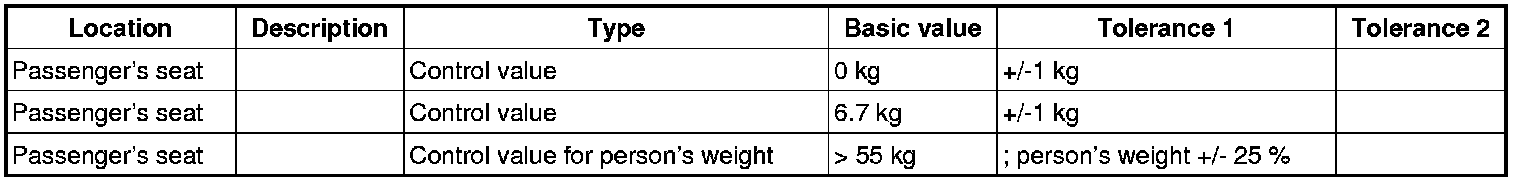 10.1.2. Place the special tool test weight P 9742 on the passenger's seat. The Passenger Airbag Off indicator light in the centre console must come on. Compare values (see table below) using the PIWIS Tester.