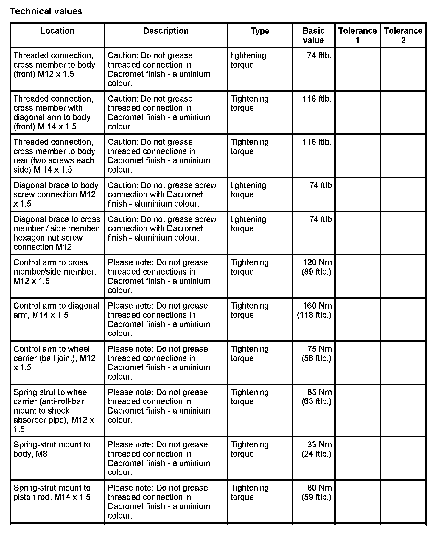 WM 400000 Tightening torques for front axle