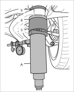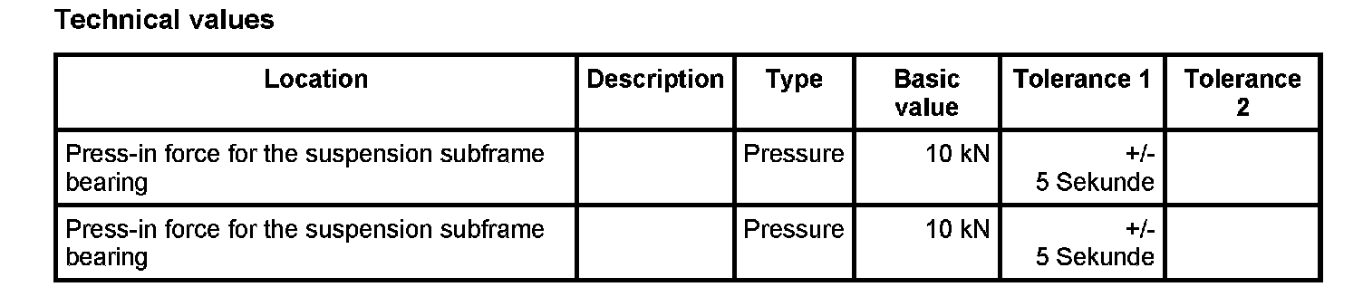 8. Press in suspension subframe bearing. To avoid damaging the bearing, the maximum - Pressure: 10 kN±5 sec. must not be exceeded at the stop (10 KN = 350 bar). This conversion applies only to the hydraulic cylinder VAS 6178. The conversion depends on the diameter of the cylinder in question.