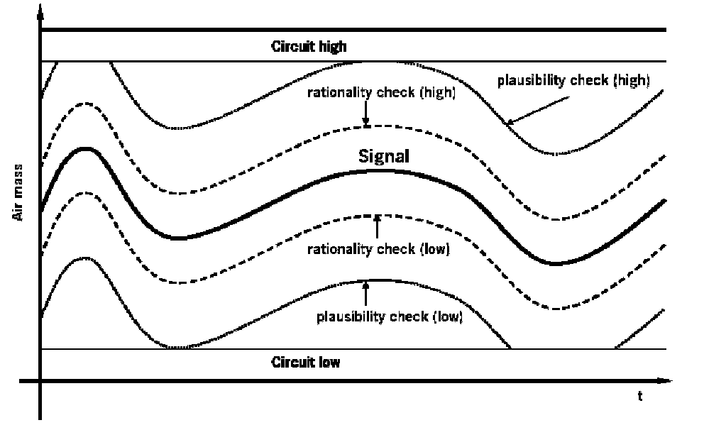 The output voltage of the air mass meter is a measure of air mass. The diagnostic routine compares the mass flow measured by the air mass meter with a calculated mass flow, derived from engine speed an throttle position.