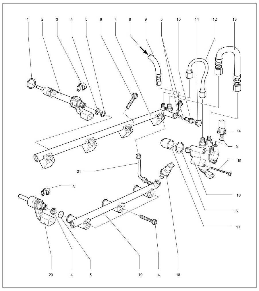 5. Check high pressure distribution pipe for leaks. Following a test drive, visually inspect the high-pressure sensor with a mirror and lamp at idle speed.