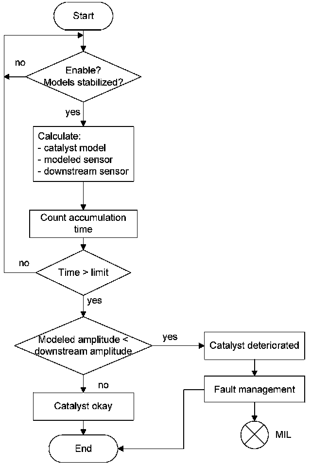 The model is simulating the oxygen storage capability of a borderline catalyst. The signal of the downstream oxygen sensor is simulated in the catalyst model based on real time engine operating data (e.g. A/F ratio and engine load). The amplitude of the modeled signal oscillations is calculated.