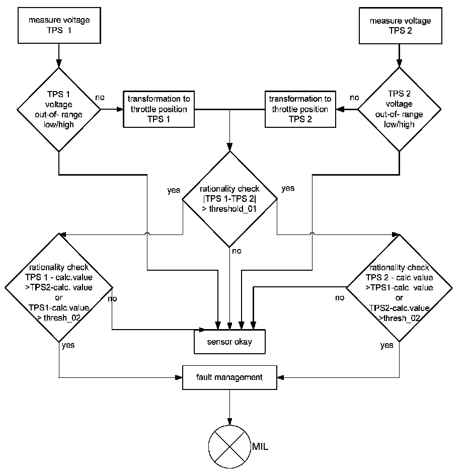 The diagnostic monitors the corrected values of potentiometer 1 and 2. In the case of a higher difference than a threshold value both signals are compared to the engine load to determine and disable the faulty one. A fault code will be stored and the MIL will be illuminated.