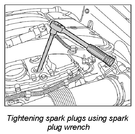 2. Tighten spark plugs using special tool spark plug wrench 3122 B. - Tightening torque: 20 Nm (15 ftlb.) - Tightening spark plugs using spark plug wrench