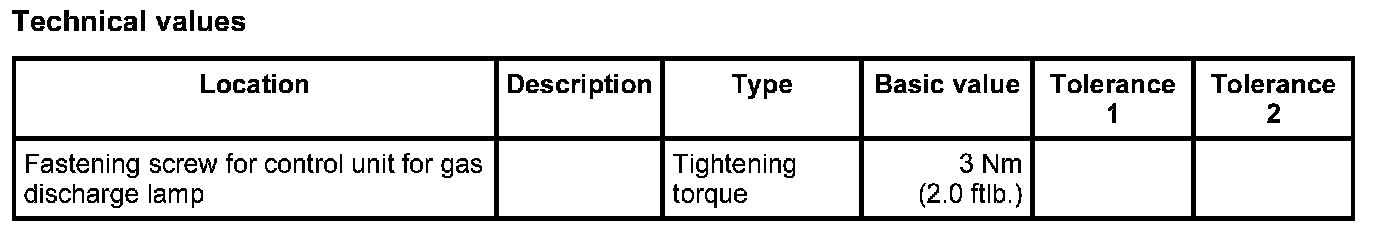 1. Position control unit for gas-discharge headlight -2- on the Bi-Xenon headlight -3- in -direction of arrow- and secure it with the three fastening screws -2-. - Tightening torque: 3 Nm (2.0 ftlb.)
