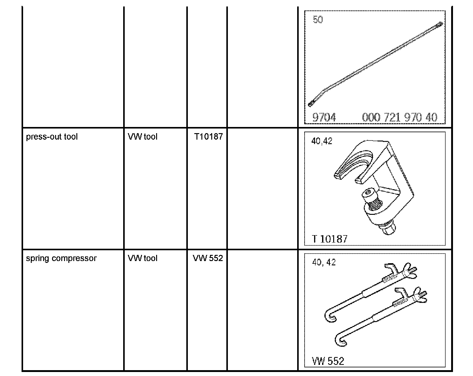 7. Fix upper axle struts with spring compressor VW 552. This involves tensioning the axle strut slightly because otherwise the top ball joint can be damaged. When doing this, engage the -connecting piece- into the top opening of the wheel well (double panel, under the wheel housing cover) and into the axle strut (do not disconnect the air spring connection!).
