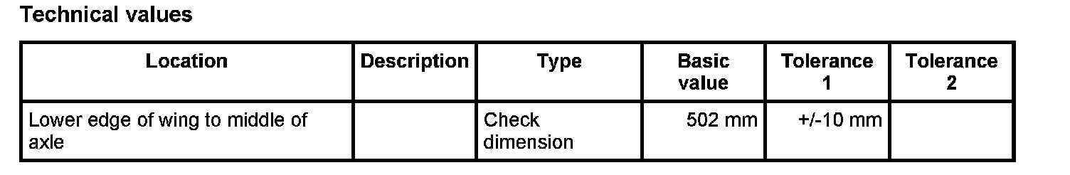 ^ The entire threaded parts of the axle must be tightened in vehicle position. Vehicle position means: vehicle standing on the wheels, or the wheel suspension is raised using a universal vehicle lift. -Dimension X-, corresponds to vehicle position. -> Check dimension: 502 mm+/-10 mm