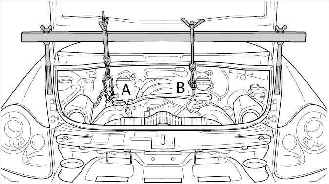 4. Position the safety device 10-222 A correctly and fit the chain to the mounting -A-. Fit the transport eyebolt 9700 for securing the engine -B- (the bore for the transport eyebolt is located between cylinder 6 and 7 on the left cylinder bank).