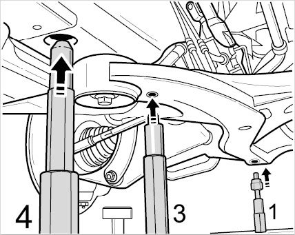 - The mounting points for the front axle carrier (1 and 3), both right and left and the two positioning guides (4) that are pushed into the body are required for removing the front axle carrier. The other mounting points can be removed.