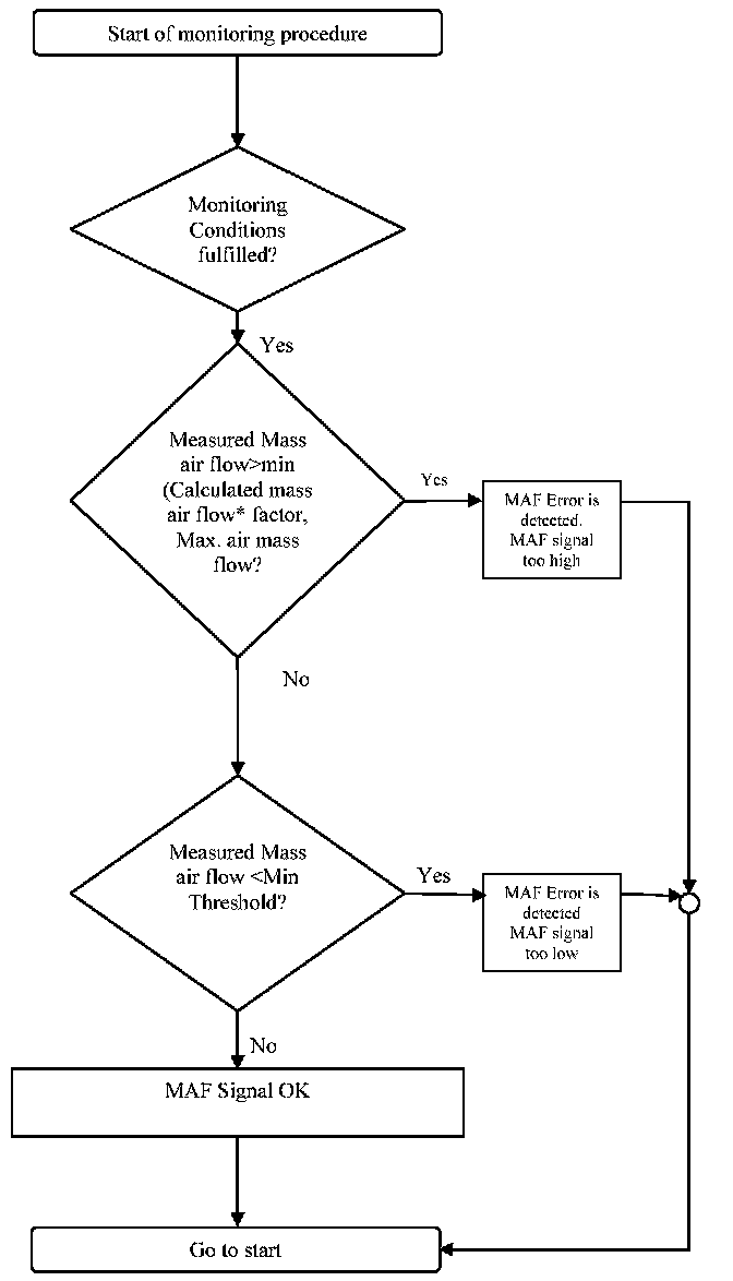 The measured air mass flow will be compared first with the minimal value of a maximal threshold and the calculated air mass flow multiplied by a factor. In case the measured air mass flow is bigger than this minimal election an error is detected (Mass air flow too high).