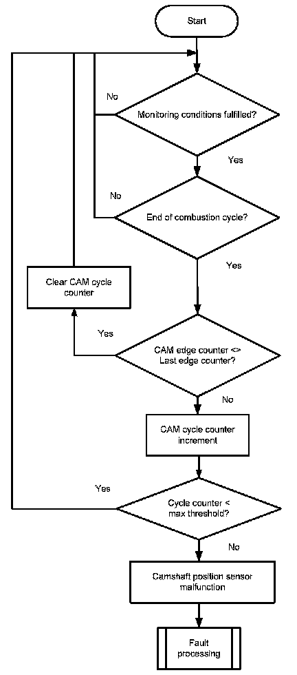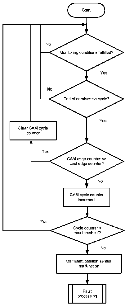 The monitor checks once per combustion cycle the edge counter of the camshaft. If the edge counter has not changed during the last cycle, a cycle counter is incremented. When the counter reaches a threshold, the error CAM_plaus is delivered to the error management.