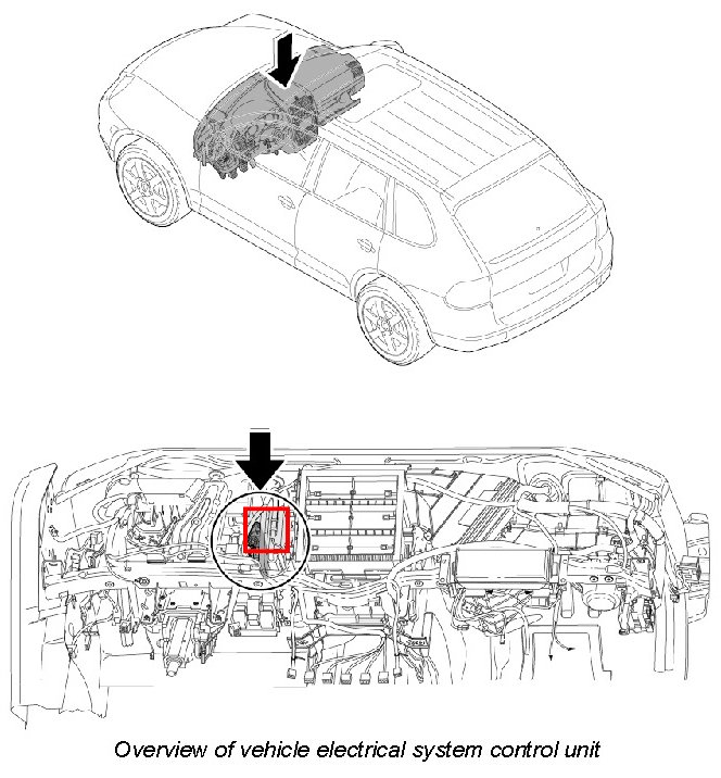 - If the control unit for the vehicle electrical system is replaced, it must be programmed using the Porsche System Tester. This will ensure that the control module is taught for the relevant vehicle, country version and equipment.