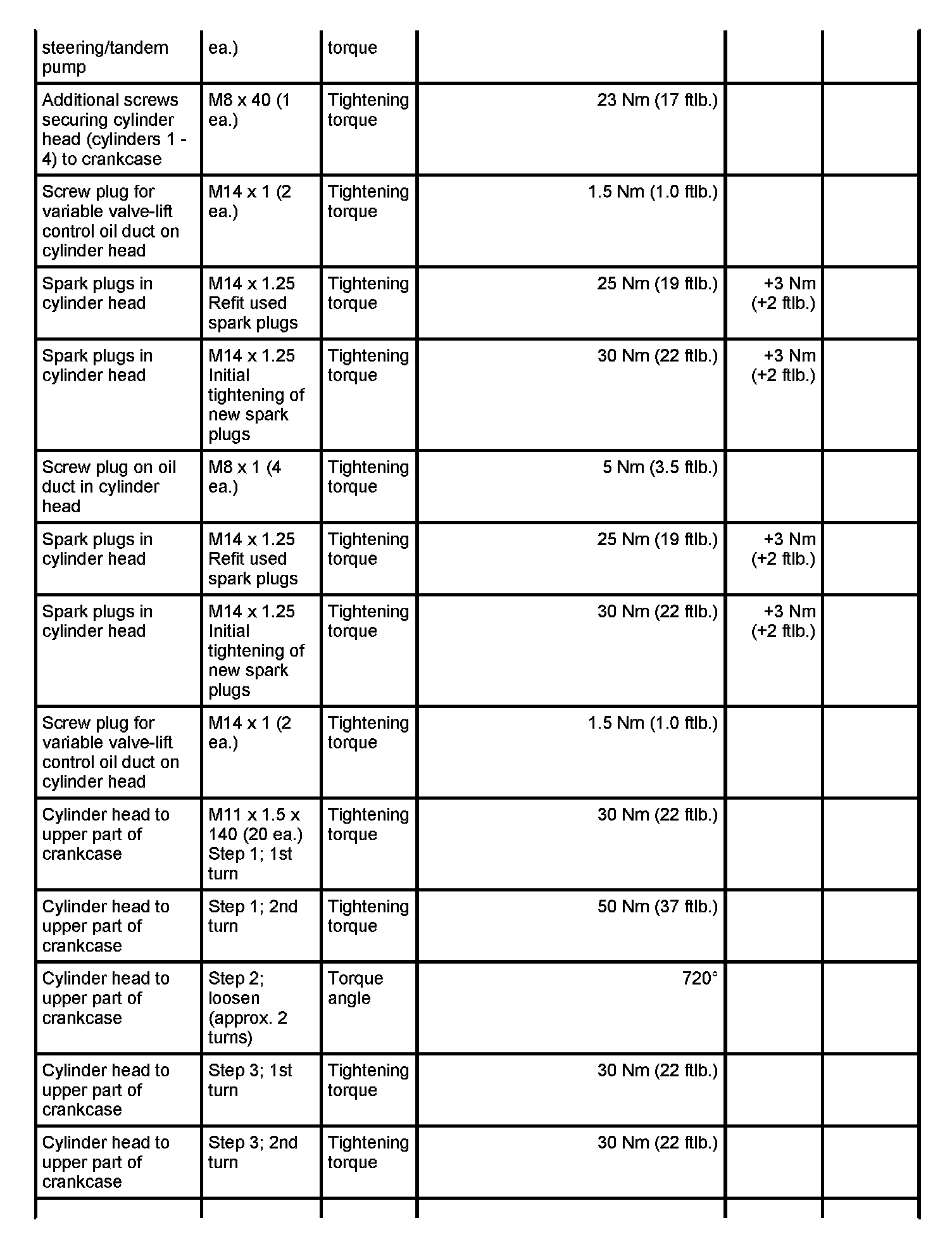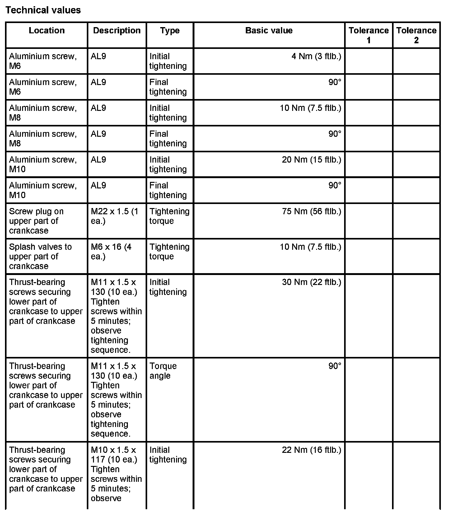 7 - Aluminium screw, M8 x 70; (cross bolt connection); always use new aluminium screws; observe tightening sequence as for steel screws - Initial tightening: 10 Nm (7.5 ftlb.) and - Final tightening: 90 degrees