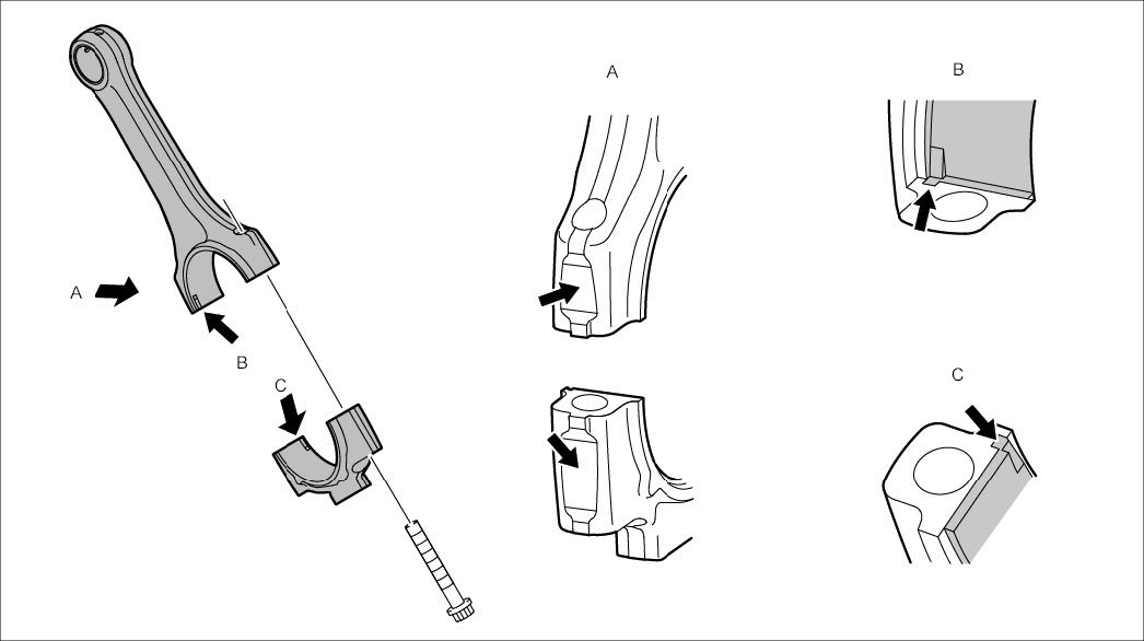 A - View A (identification area for connecting-rod number; fit connecting rod with identification area facing exhaust side; markings on rod and cap must be on the same side)