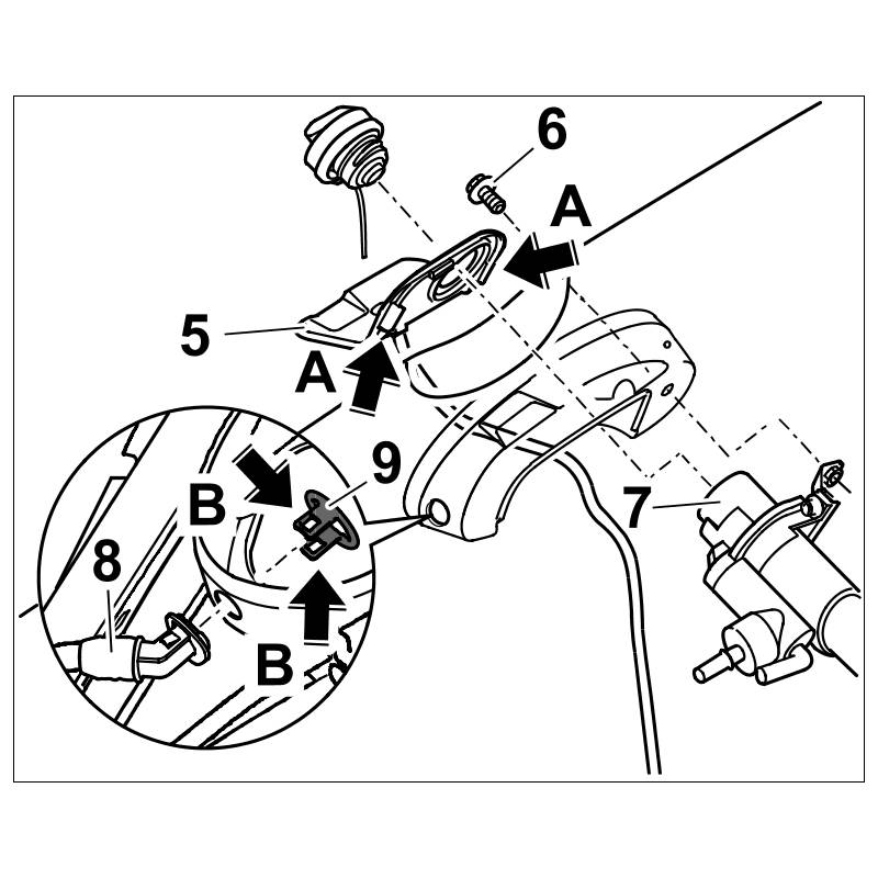 1. Install angled pipe -8-. Press in the plastic clip -9- until the locking tabs -B- engage audibly.