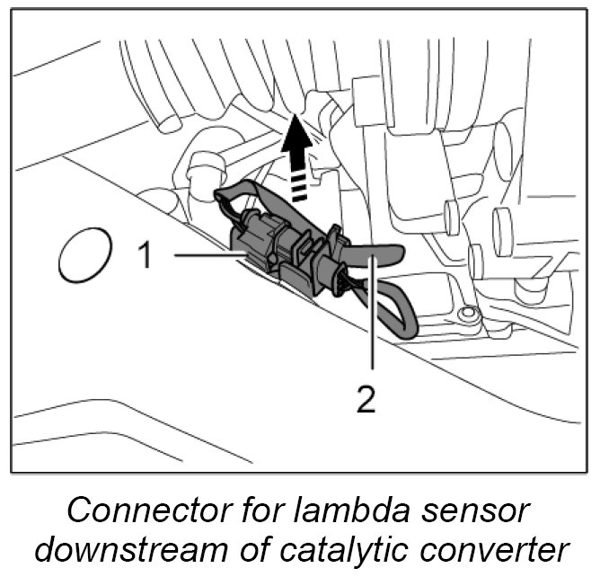 2.2. Unclip and open the plug connection -1- for the lambda sensor downstream of the catalytic converter (black cable -2- ) on the rear-axle cross member.