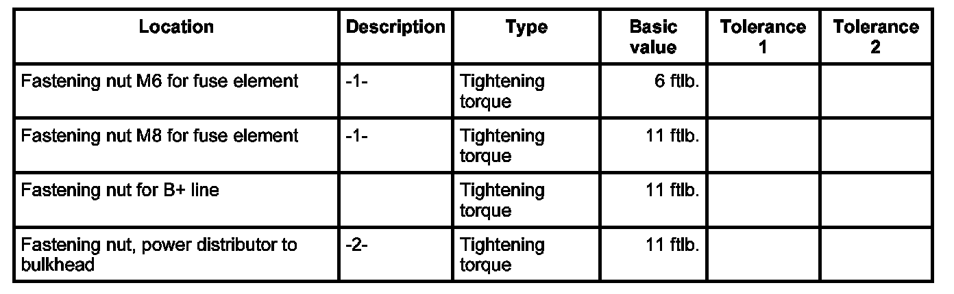 1. Position the fuse elements -3- in the power distributor in accordance with the wiring diagram and position the marked connection leads in turn, fit the washer -2- and tighten with the fastening nuts -1-. - Tightening torque: 6 ftlb. - Tightening torque: 11 ftlb.