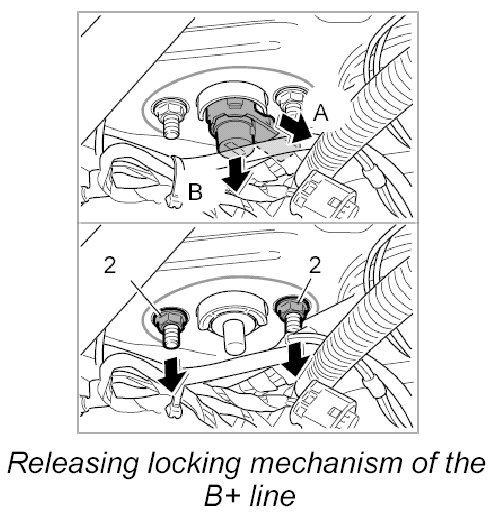 2. Release the locking mechanism of the B+ line -A- and pull off the B+ connection from the power distributor -B-.