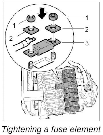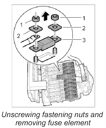 9. Unscrew the fastening nuts -1-, remove the washer -2- and take out the fuse element -3-