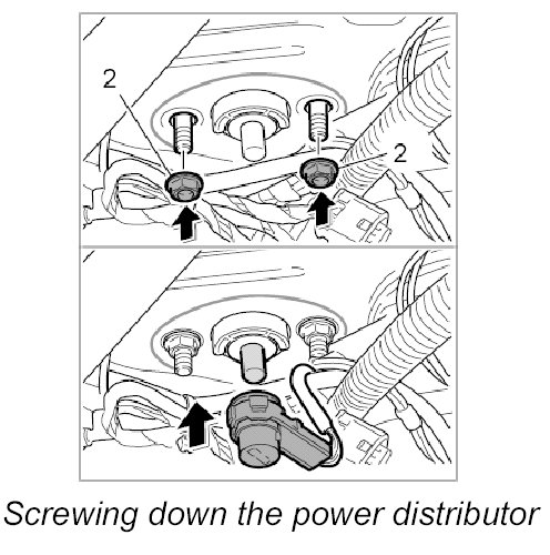 7. Screw down power distributor with the two fastening screws -2-. - Tightening torque: 11 ftlb.