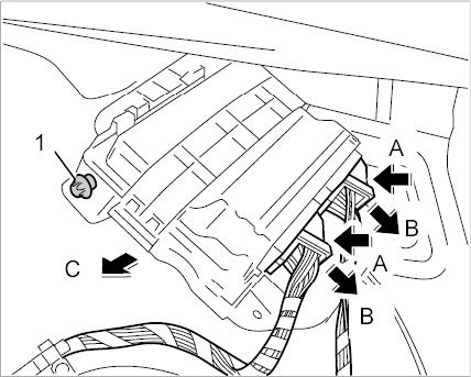 2.2. Release the holder at the four clips -arrows B- and remove transmission control unit (PDK) -1- from the holder -arrow C-.