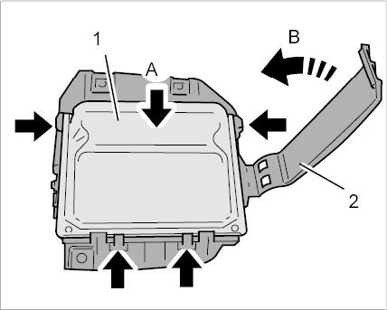 1.1. Press transmission control unit (PDK) -1- into the holder -arrow A- until the four clips -arrows- engage securely.