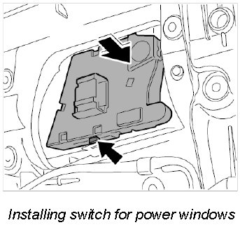 1. Insert the switch for power windows into the mounting points at the door trim panel using the locking tabs.