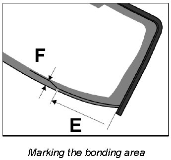 1. Before applying the adhesive, mark the course of the adhesive bead in accordance with the dimensions -E- = 160 mm, -F- = 30 mm on the left and right on the lower edge of the windscreen.