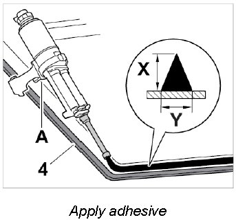 1. Using the bonding gun -A-, apply 2-component adhesive to the windscreen along the seal -4- in the form of a triangular bead measuring -X= ca. 15 mm- -Y= ca. 8 mm-.