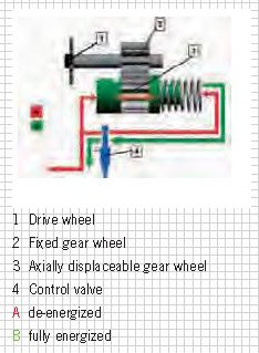 Depending on the input values for engine speed, engine load, engine oil temperature and the expected change in engine speed, a specific control valve (4) position is defined using a map in the DME control unit. The control valve position regulates the oil pressure for the spring piston on the gear wheel, which can move in axial direction. The oil pressure on the control piston is not regulated on the other side. The control valve is open fully in the non-energized state and as a result, the oil pressure is the same on both sides, which means that the gear wheel will not move. In other words: the pressure difference between the spring piston and the control piston can be used to control every position. When the gear wheel moves, the teeth are still only partially engaged and as a result, power and friction as well as energy requirements are reduced.