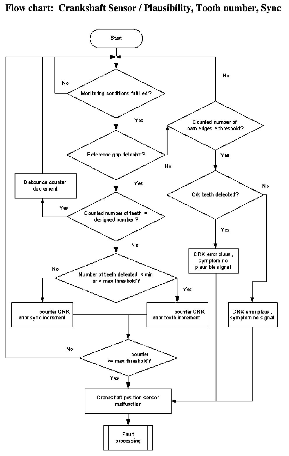 A teeth counter is incremented at every falling edge of the CRK sensor signal. If plus or minus one tooth is detected Flowchart diagnosis of mechanical reference position and diagnosis of chain jump. 360 °CA at the reference gap, the tooth number counter will be incremented. If the counter exceeds a limit, a CRK tooth error is delivered to the error management.